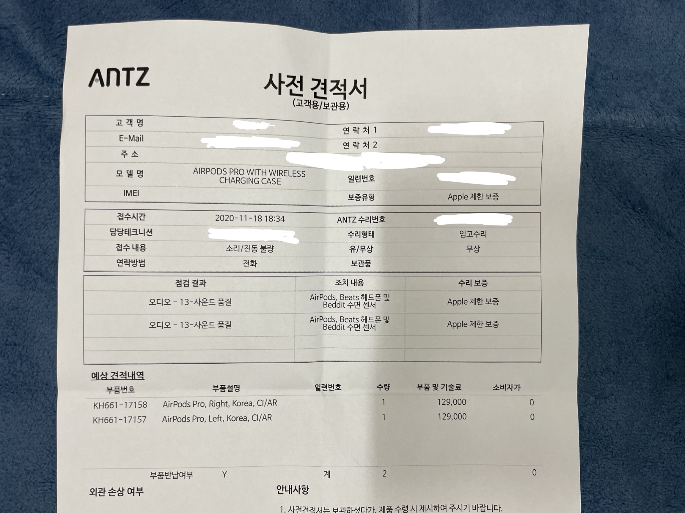 실제로 노캔에 익숙해진건지 노캔 성능이 떨어진건지는 모르겠지만 이전보다 음량을 더 높여야 하는거 같다는 느낌도 들었고. 여하튼 유닛 교체를 하고 싶었는데 덕분에 양쪽 유닛을 새로 받을 수 있었습니다. 그런데 바로는 못 받았어요. 현재 애플에서 사운드 문제가 있는 에어팟 프로에 대한 서비스 프로그램을 진행중이고 덕분에 사람이 몰려서 재고가 없다고 하더군요. 저는 2일 걸렸습니다. 18일 수요일에 맡겨서 20일 금요일날 찾을 수 있었어요.