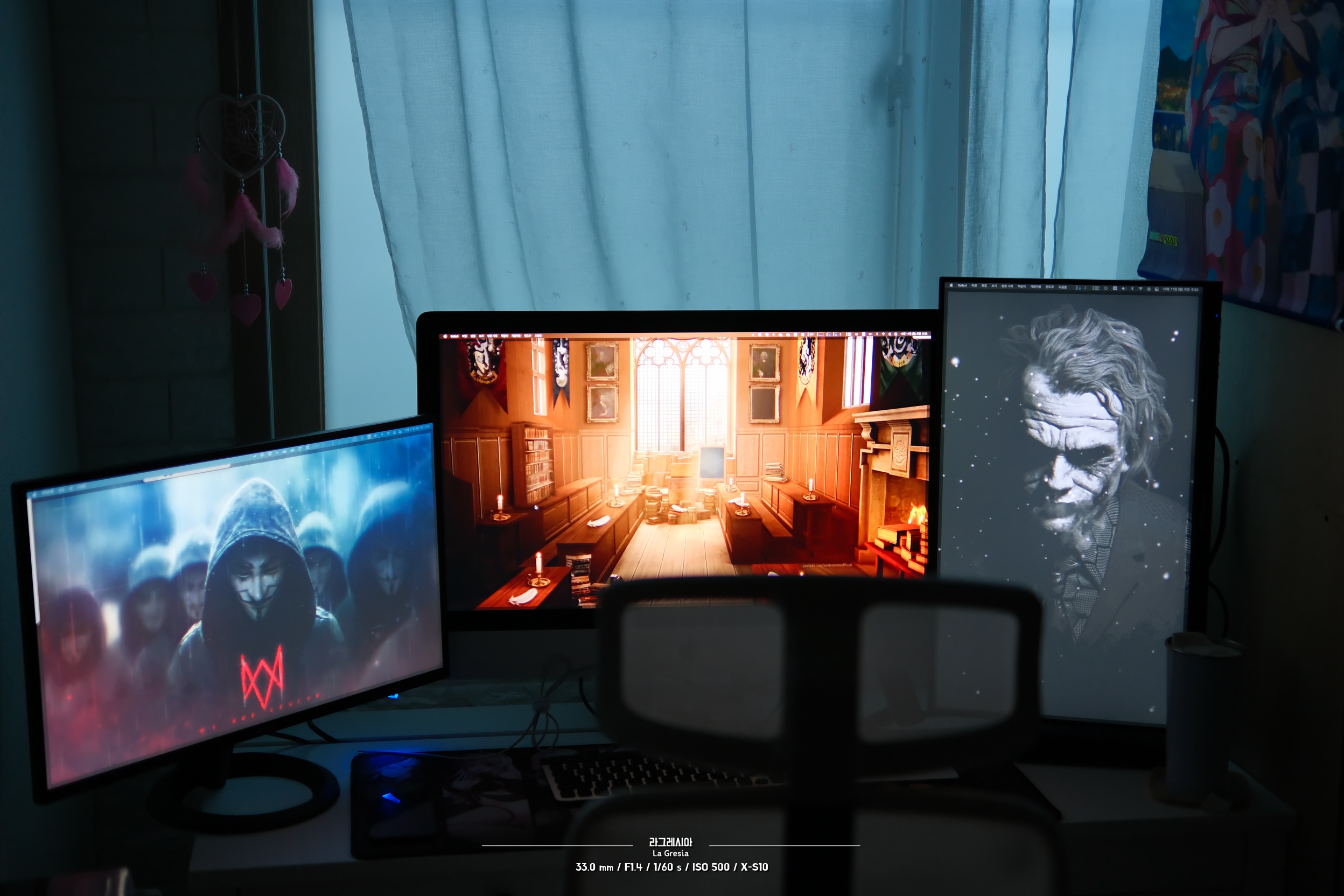 그렇게 구성한 트리플모니터. 사실 모니터 세개를 전부 가로로 배치하고 싶었는데 공간이 도저히 나오지 않아 하나는 부득이하게 세로로 세운거긴 하지만요. 그런데 이 세로로 세운 모니터 활용도가 굉장합니다. 문서나 뉴스를 자주 읽어제끼는 저에게는 가로보다 오히려 세로가 낫더라구요. 스크롤을 더 적게 해도 됩니다.