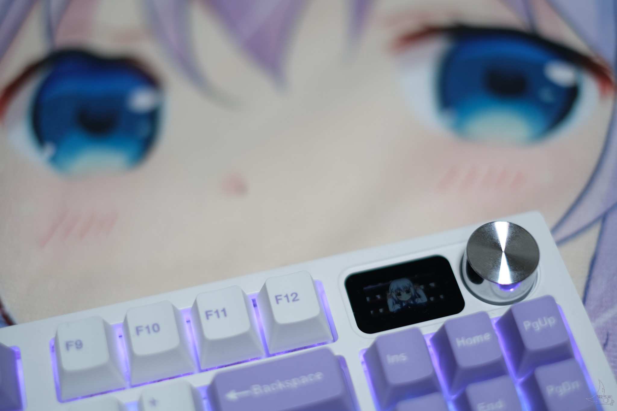 노브 왼쪽에 있는 LCD창은...제품 설명 이미지와는 다르게 베젤도 두껍고 엄청 선명하지는 않은데 볼때마다 흐뭇해지는건 치노쨩이 코코로뿅뿅 하고 있어서 그렇습니다. 타이핑 한창 하다가 잠시 멍때리고 치노쨩 보다보면 괜히 웃음지어지는거 있죠. 그것 자체만으로도 이미 할 일 다 한 겁니다. 아쉬운건 그거 넣으려면 Windows 부팅해서 프로그램 실행해야 하는거. Mac용도 만들어주면 안되겠니? 그 외에도 LCD창이 있어서 생기는 이점은 키보드 배터리 잔량을 바로바로 볼 수 있다는 점.